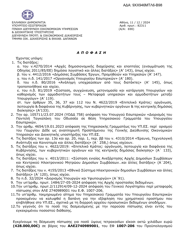 Την Τετάρτη 11 Δεκεμβρίου το υπουργείο Εσωτερικών ανάρτησε στη Διαύγεια, με αριθμό πρωτοκόλλου 82311, την εξωπραγματική απόφασή του: «Εγκρίνουμε τη δέσμευση πίστωσης για ποσό ύψους τετρακοσίων είκοσι οκτώ χιλιάδων ευρώ (428.000 ευρώ) σε βάρος του Προϋπολογισμού Εξόδων του Υπουργείου Εσωτερικών οικονομικού έτους 2024, προκειμένου να καλυφθεί η δαπάνη για την εξόφληση του χρηματικού προστίμου που επιβλήθηκε στο ΥΠΕΣ, σχετικά με τη διαρροή αρχείου προσωπικών δεδομένων αποδήμων».