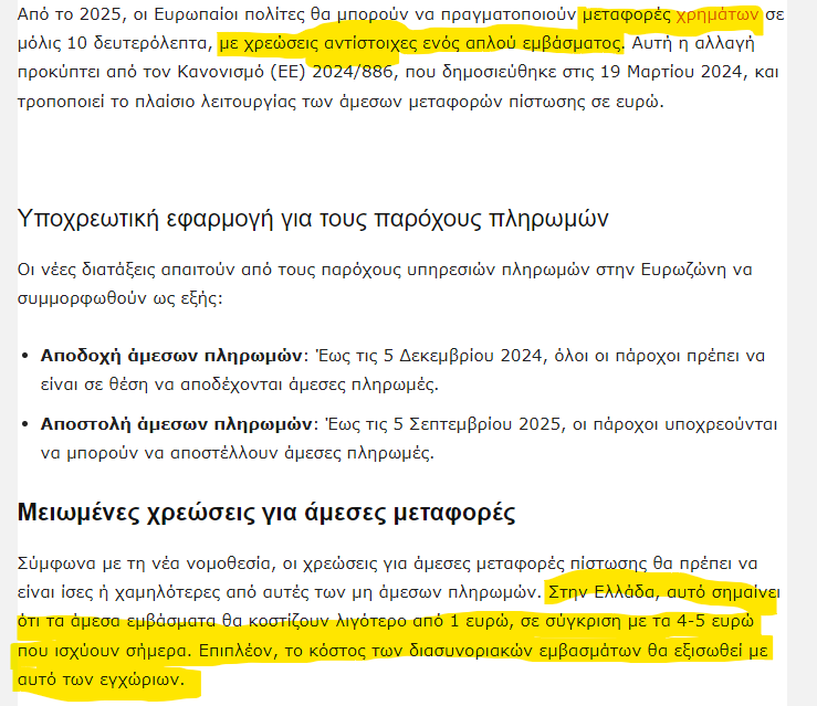 1) Στις 19 Μαρτίου 2024, δημοσιεύθηκε στην Επίσημη Εφημερίδα της ΕΕ ο Κανονισμός (ΕΕ) 2024/886 «για την τροποποίηση των Κανονισμών (ΕΕ) αριθ. 260/2012 και (ΕΕ) 2021/1230 και των Οδηγιών 98/26/ΕΚ και (ΕΕ) 2015/2366 όσον αφορά τις άμεσες μεταφορές πίστωσης σε ευρώ». Σύμφωνα με το άρθρο 6, ο Κανονισμός τίθεται σε ισχύ στις 8 Απριλίου 2024.