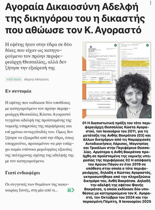 Σύμφωνα με το Documento: Σε δύο δίκες του πρώην Περιφερειάρχη Θεσσαλίας Κώστα Αγοραστού, η δικαστής που τον δίκασε, ήταν η αδερφή της δικηγόρου του. Δεν ζήτησε εξαίρεση όπως απαιτεί ο νόμος, το απέκρυψε και την δίκασε σαν να μην υπάρχει κώλυμα. Μαντέψτε το αποτέλεσμα.