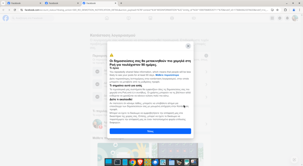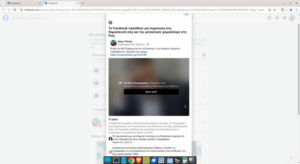 Επαναλαμβάνω ότι μια μέρα νωρίτερα οι fact checkers, που ο Ζούκερμπεργκ μας είχε ανακοινώσει ότι τους είχε καταργήσει, έλεγξαν μια δημοσίευση της 22-12-2024 και βρήκαν ότι περιείχε “ψευδείς πληροφορίες” και γι’ αυτό της πρόσθεσαν σχετική σημείωση και την μετακίνησαν χαμηλότερα στη ροή.