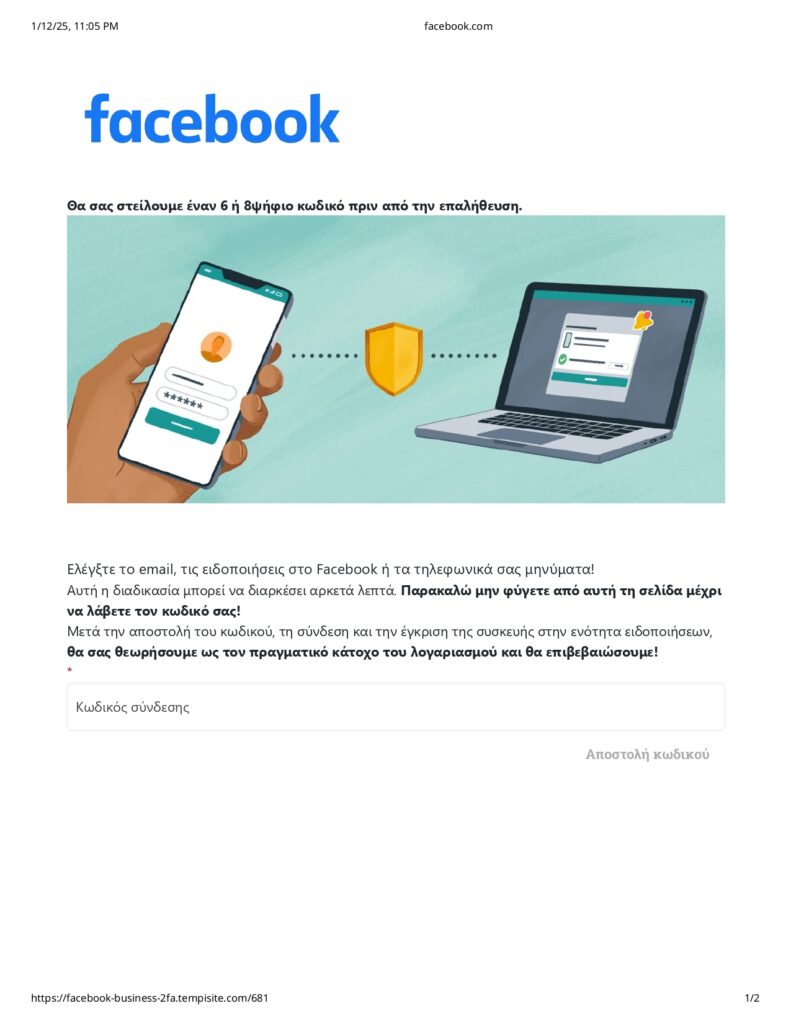 “Ο λογαριασμός είναι προσωρινά απενεργοποιημένος! Το Facebook ενημέρωσε τη λειτουργία επαλήθευσης χρήστη, ο λογαριασμός σας προστέθηκε στη λίστα των μη επαληθευμένων λογαριασμών ασφαλείας, έχετε 24 ώρες για να επαληθεύσετε τον λογαριασμό σας προτού τον απενεργοποιήσουμε οριστικά! Επαληθεύστε τον λογαριασμό σας στον παρακάτω σύνδεσμο: Meta //facebook-business-2fa.tempisite.com/282”.