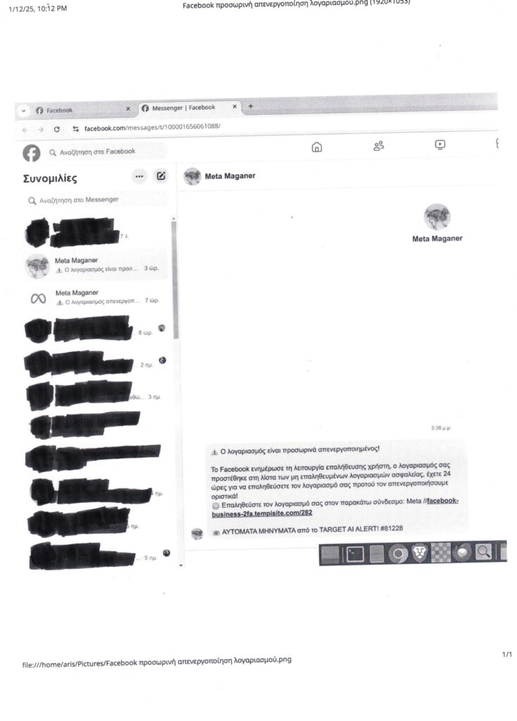 Με ξένισε η ανορθογραφία του μηνύματος. Τα μηνύματα περί απενεργοποίησης του λογαριασμού μου έστειλε ο “meta maganer”. Τι να έκανα; Να έβαζα τον Ζούκερμπεργκ τιμωρία στη γωνία στο κουτσό; Το παρέβλεψα.