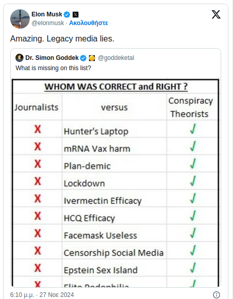 Χαρακτηριστικό παράδειγμα: Αναδημοσίευσα στο oudensxolion.gr ανάρτηση του Έλον Μασκ (https://oudensxolion.gr/?p=2765). Με απλά λόγια ο Μασκ ισχυρίστηκε ότι τα ΜΜΕ μας ταΐζουν φούμαρα, ενώ οι συνωμοσιολόγοι βγαίνουν συνεχώς αληθινοί. Ουσιαστικά ο μεγαλομέτοχος του twitter διαφήμισε την επιχείρησή του εννοώντας “μη βλέπετε τηλεόραση, μη διαβάζετε εφημερίδες, εμπιστευτείτε το ελεύθερο twitter για να μαθαίνετε την αλήθεια”. Ρίξτε μια ματιά και μόνοι σας: