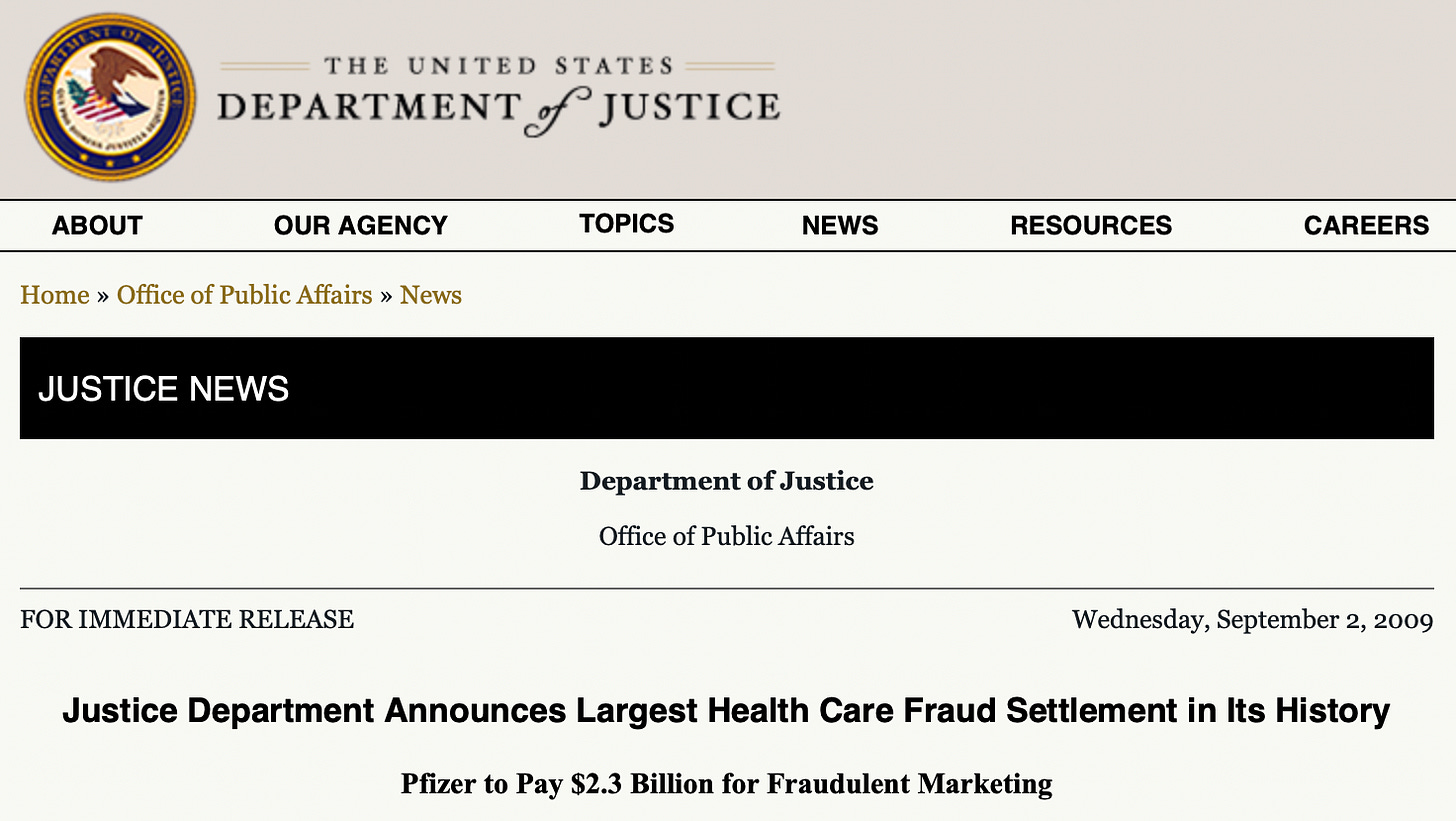 Σχετικά με αυτό, οι αμερικανικές υγειονομικές αρχές ενημέρωσαν το κοινό ότι η Pfizer έχει ποινικό μητρώο στο Υπουργείο Δικαιοσύνης των ΗΠΑ. (2009). Είναι η μόνη μεγάλη φαρμακευτική εταιρεία που έχει ποινικό μητρώο στις ΗΠΑ.