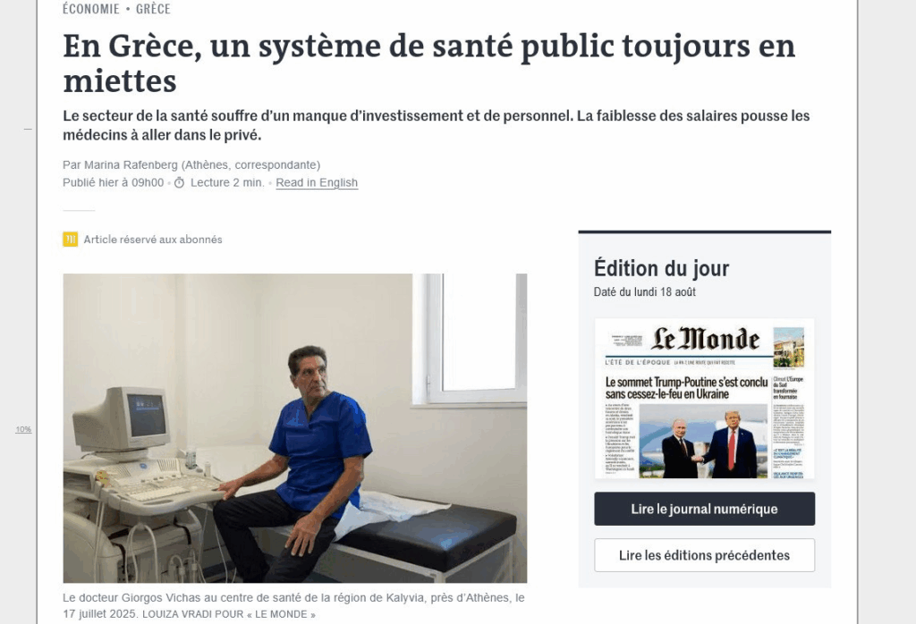 Η γαλλική εφημερίδα αναφέρει πως ο τομέας της υγείας στην Ελλάδα υποφέρει από έλλειψη επενδύσεων και προσωπικού, ενώ κάνει λόγο «για χαμηλές αμοιβές που ωθούν τους γιατρούς να στραφούν στον ιδιωτικό τομέα».